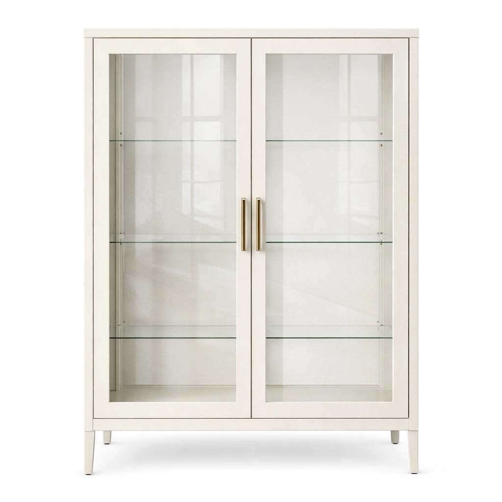 Vitrine Weiß MDF mit Glasregalen und Metallbacken