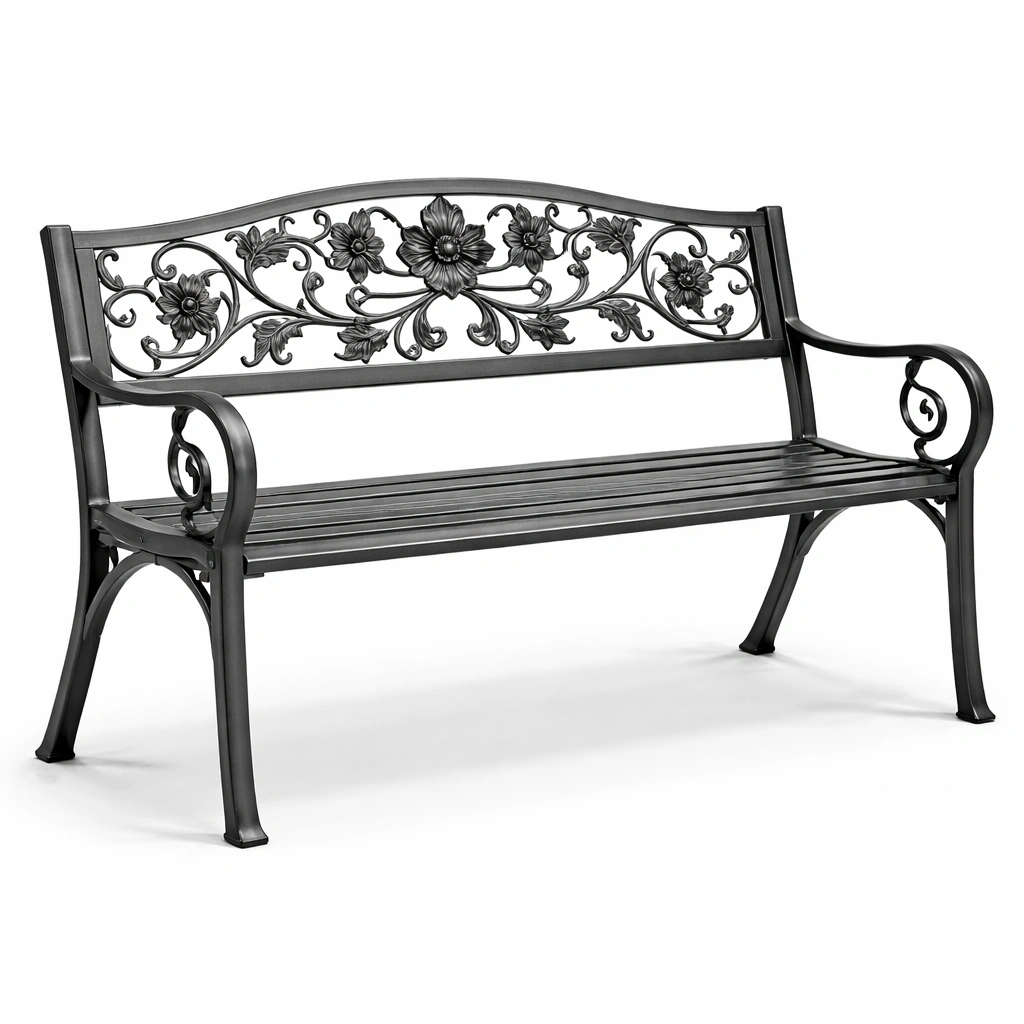 Die Gartenbank besteht aus pulverbeschichtetem Metall.